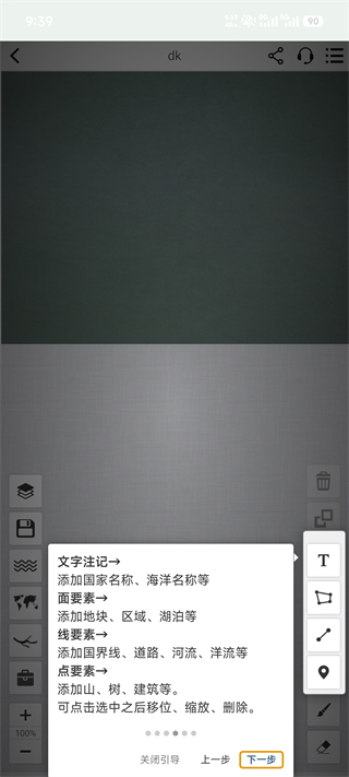 通过引导提示介绍图层管理、自动生成大陆、笔刷工具等核心功能,帮助新手快速熟悉创作工具。