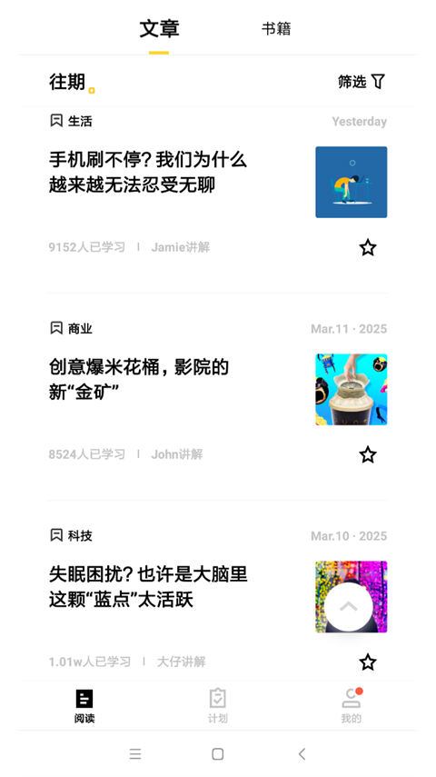 流利说阅读定期为用户推送精选的英文文章,内容涵盖文化、科技、经济、教育、娱乐等多个领域,确保用户接触到最新的知识和语言表达及丰富多样的语言素材。