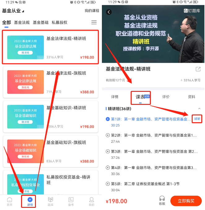 课程试看:选择对应科目,选择科目课程,进入后即可看到试看标识。