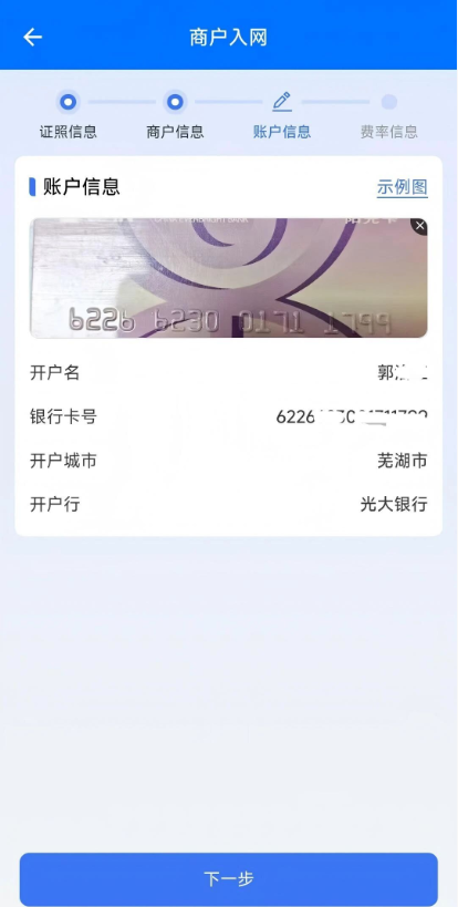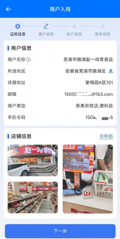 七、参照下图,商户名称需要:“地区+名称+行业”填写如“芜湖市即地区,赵一鸣即名称,零食店即行业”,地址要精确到“什么路多少号”。