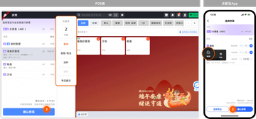第2步:进入该页面前选中的菜品会作为主菜,后续POS端可点击右侧菜品(需打开允许拼菜开关的菜品)添加拼菜;点餐宝App点击“选择菜品”进到菜品选择页添加拼菜。