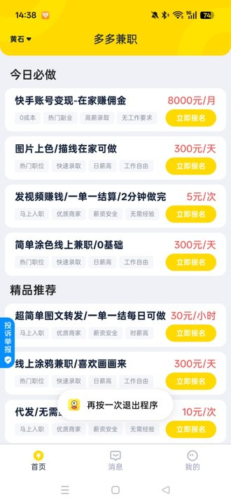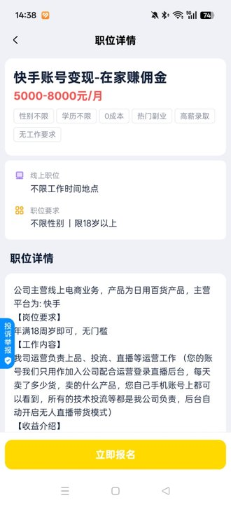 2、来到首页兼职报名任务界面,点击你要参与的工作部分,然后选择立即报名。