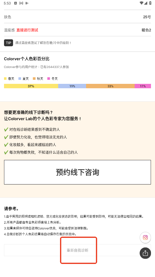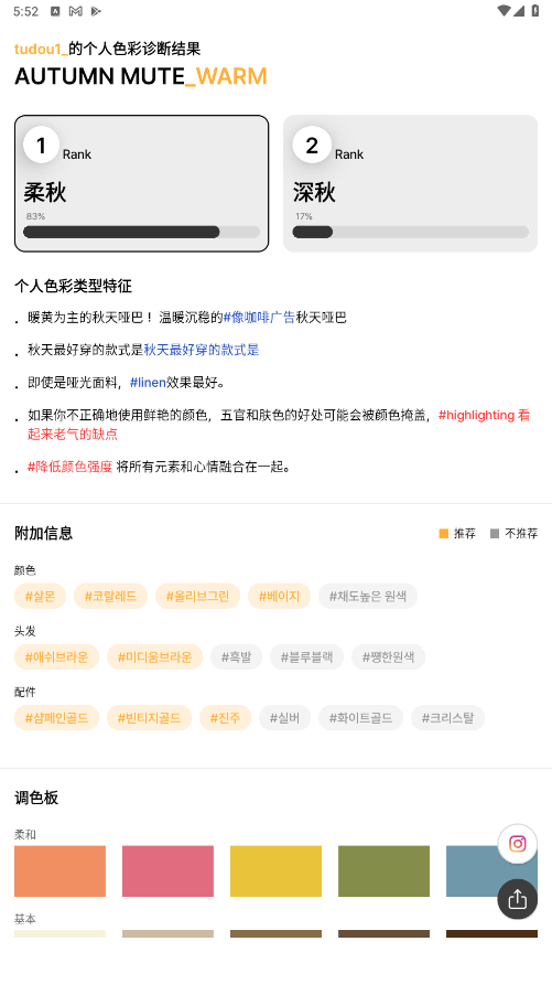 4、获取诊断结果:完成所有检查步骤后,软件将生成个人色彩诊断结果。用户可以下拉页面查看推荐的颜色、妆容色调、发色和美瞳颜色等个性化建议。