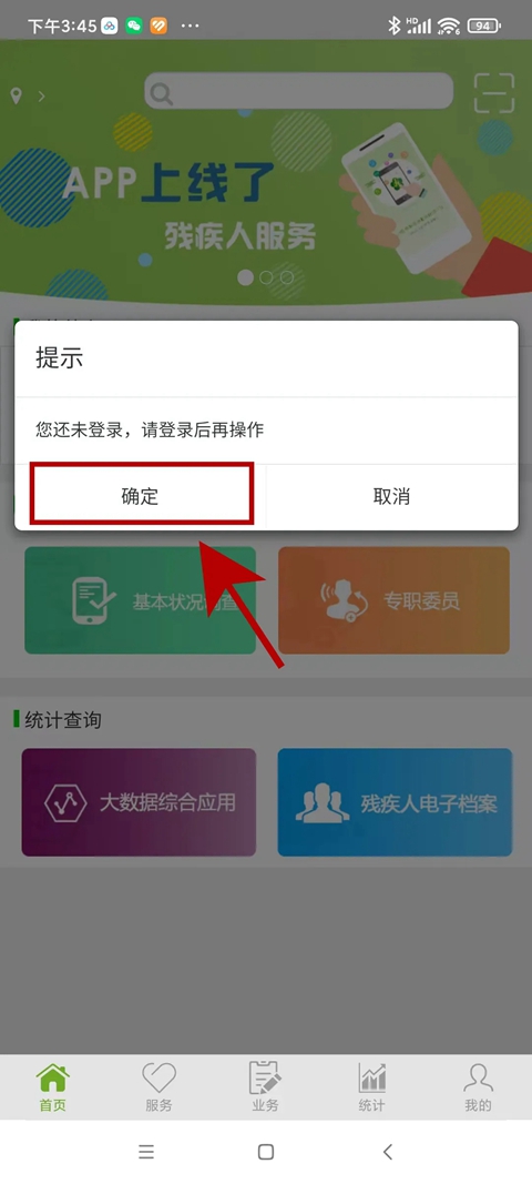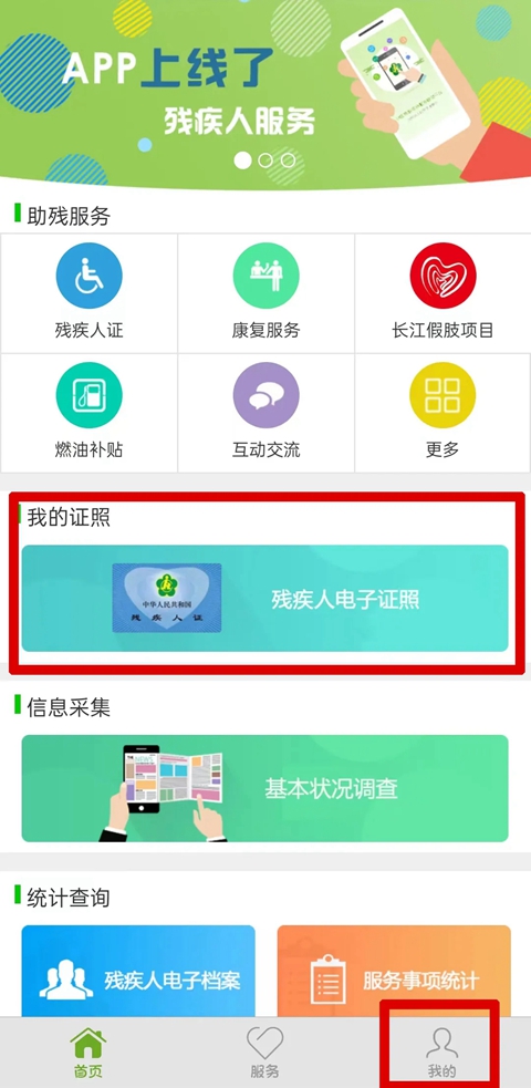 第二步,在上面图中找到残疾人电子证照,点击残疾人电子证照,会提示登录账号,点登录或者点右下角我的,出现登录界面。