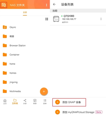 1、 打开Qfile Pro,点击左上角NAS小图标,点击“添加QNAP设备”