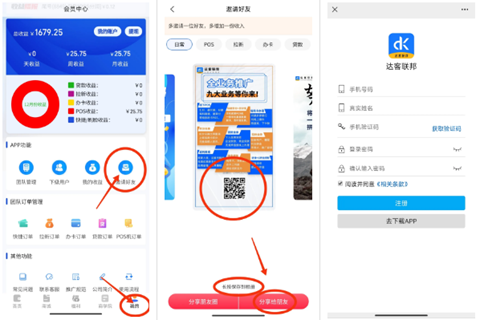 推荐人在达客联邦APP--我的--邀请好友,选择一张分享名片,点击下方的【分享给朋友】或者长按图片保存