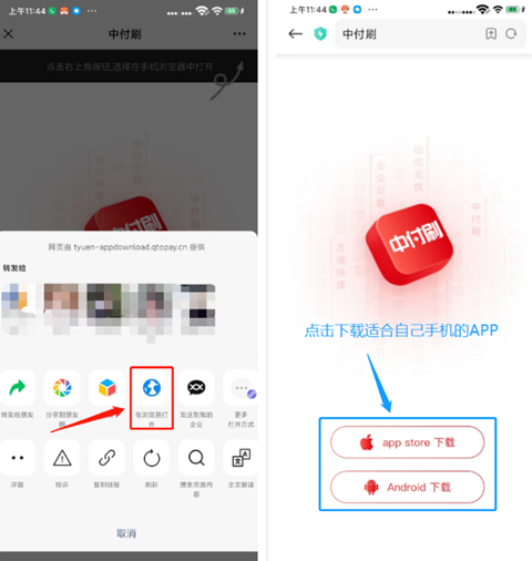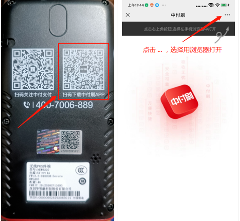 1、扫描机器盒子或者机器上的【中付刷】APP下载二维码,从浏览器中下载并安装好APP