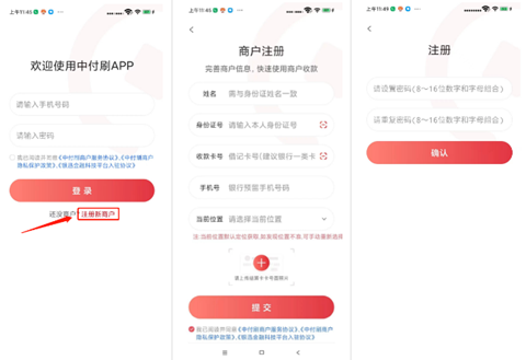 2、打开中付刷APP后,点击【注册新商户】,按照页面提示填写相关身份证信息和银行卡信息,提交后设置登录密码。(建议直接拍照或者上传身份证人像面和银行卡卡号面,系统会自动识别填写)