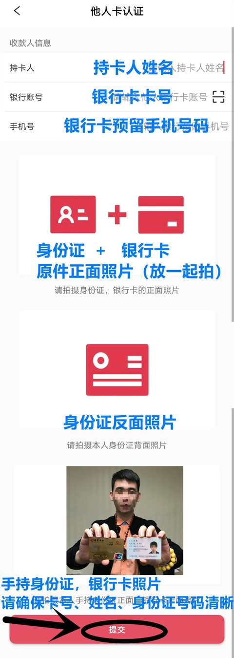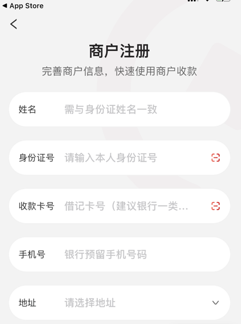 填写:商户注册,姓名,身份证号,收款卡号借记卡号(建议银行一类卡),银行预留手机号,使用地址。并上传结算卡卡号面照片。