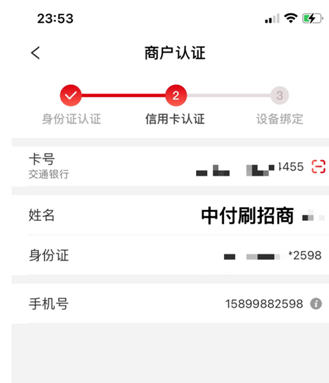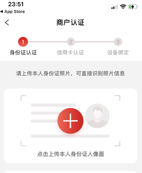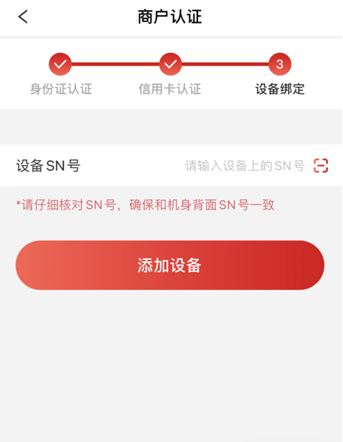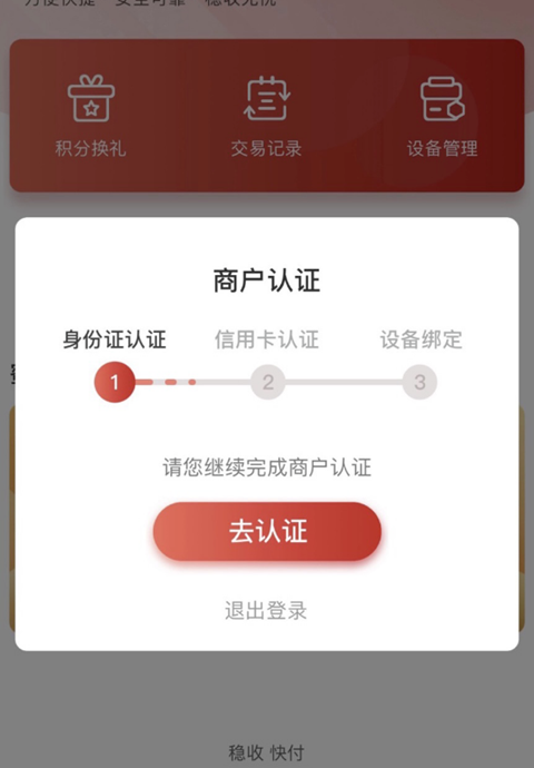 3、商户认证:先后进行身份证认证, 信用卡认证 ,设备绑定 ,点击去认证,继续完成商户认证。