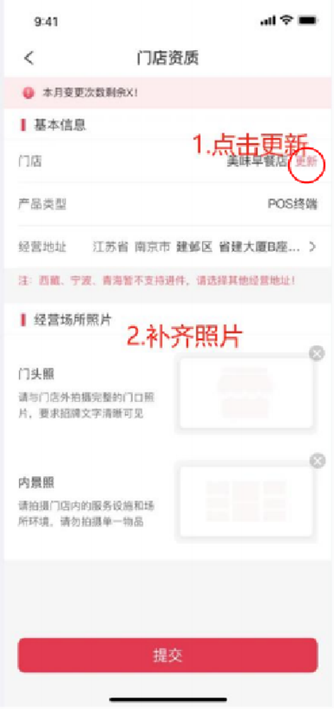 第三步:点击门店名称旁边的更新, 选择门店名称更新, 补齐照片后再提交