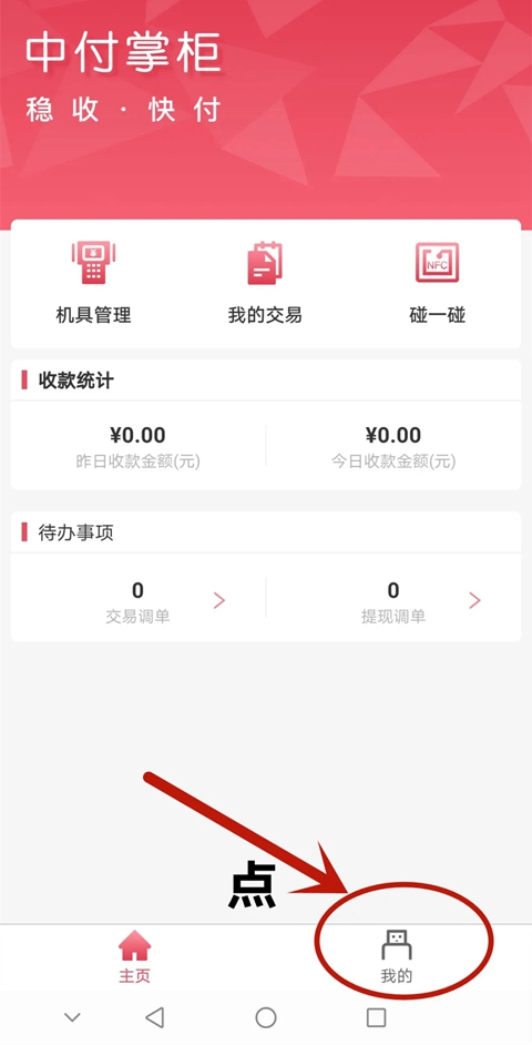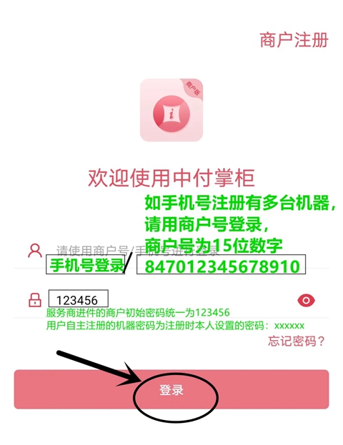 1、打开【中付掌柜商户版APP】,用手机号或者商户号登陆。