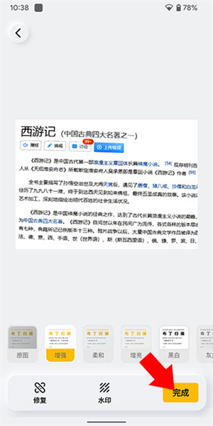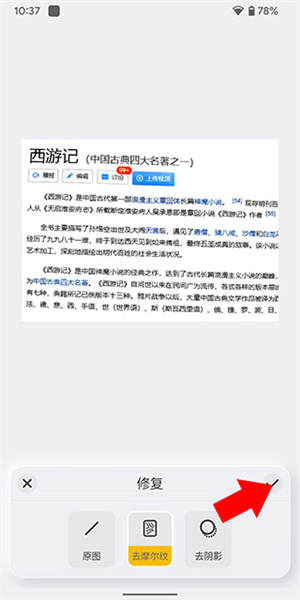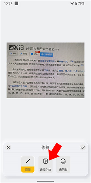 3、裁剪与修复图片:拖动黄色边框调整扫描范围,裁剪出有效内容。若图片存在摩尔纹或背景杂乱,点击左下角修复按钮,使用去摩尔纹功能提升画质。