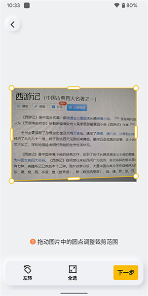 3、我们以文档扫描为例,先拍下使用相机拍下照片,来到下方界面后,我们裁剪好需要扫描的文档,然后点击下一步