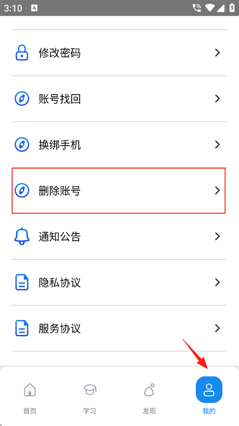 1、打开渤钻教培在线培训平台软件,点击我的-删除账号;