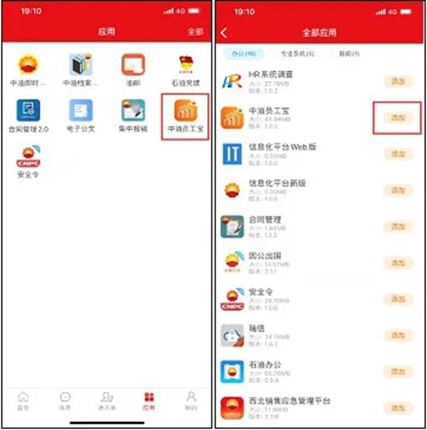 打开【移动平台APP】,在“应用”类下,全部应用页面,选择【中油员工宝】图标 点击【添加】,生成“安全令”快速访问图标。