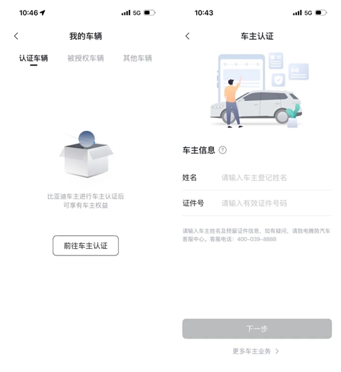 车主认证操作路径:登录APP→我的→我的车辆→前往车主认证,填写车主信息后提交认证。