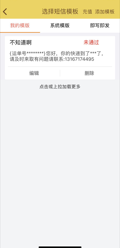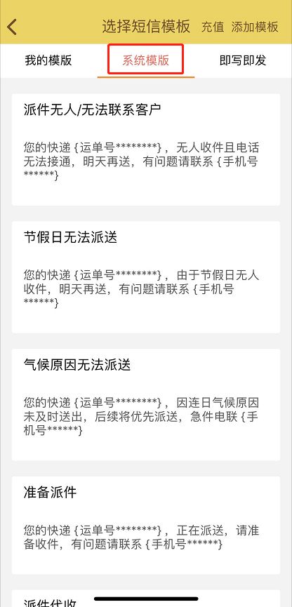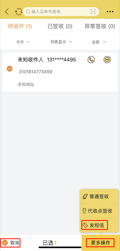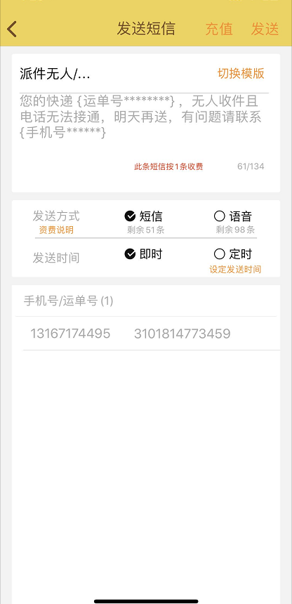 在待派件中点击订单右边的短信图标就会进入发送短信界面