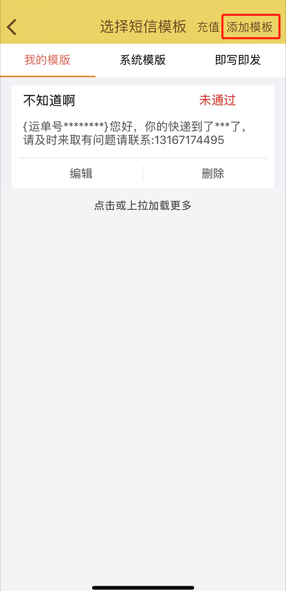 我的模板:需要先点击右上角的添加模板,添加一个模板后才可以选择,添加模板的内容和标题是可以自己,添加模板后是需要审核的,若是着急使用需要钉钉联系‘韩栋’或者使用即写即发功能