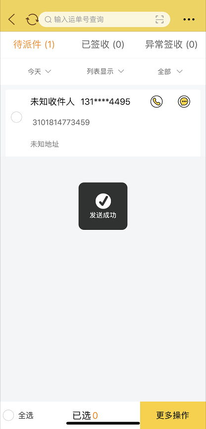 点击下一步就会进入选择发送方式界面,选择语音,点击右上角的发送,发送成功后返回待派件界面并提示发送成功