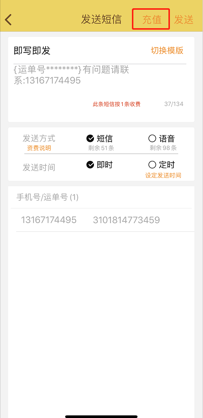 注意:发送语音短信前请先确认是否有足够的语音余额,若够或者没有请在选择短信模板界面或在选择发送方式界面,右上角点击充值按钮