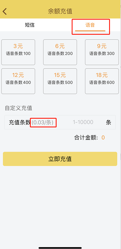 充值语音余额,每条语音收费0.03分,充值数量可以自己选择