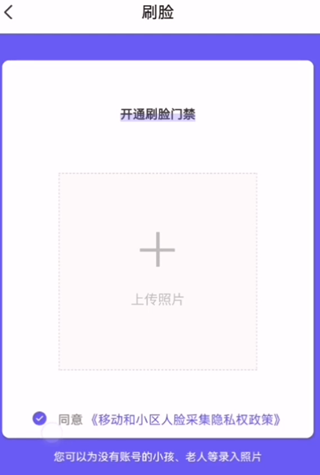 使用手机号码登陆 “移动和小区” APP--点击开门—点击刷脸—点击+--在手机相册(自拍上传人脸)照片即可完成人脸信息。