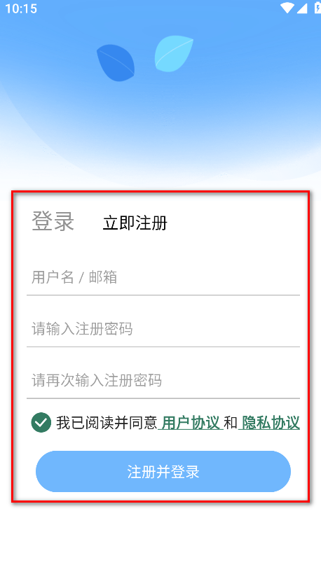 4.请输入用户名/邮箱,注册密码,再次输入注册密码,勾选我已阅读并同意用户协议和隐私协议,点击注册并登录即可。