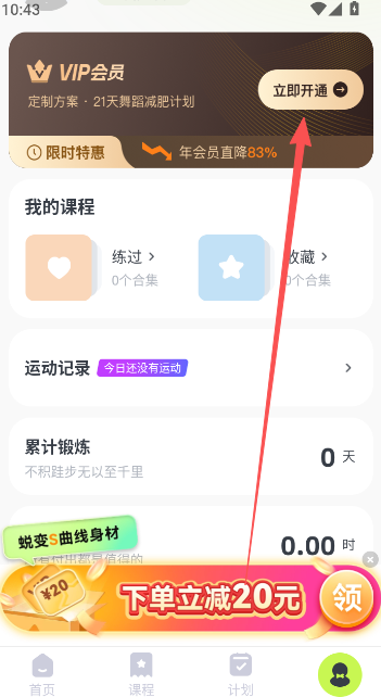 热汗舞蹈:登录后输入身高、体重等信息,系统自动计算BMI并定制个性化21天练习计划,用户可选择全身或特定部位锻炼,计划更具针对性。