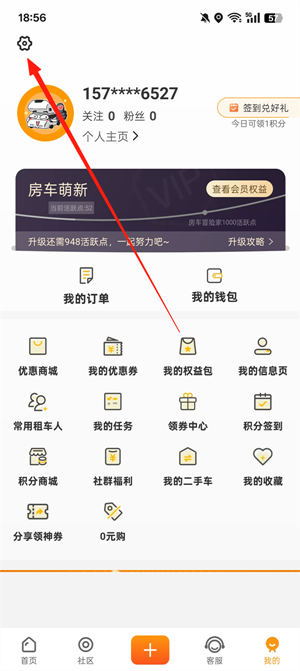 1、启动房车生活家应用,点击登录或注册完成账户的登入或创建。