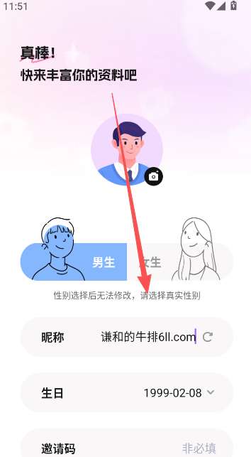 2、选择性别身份,完善用户个人信息部分进入主页。