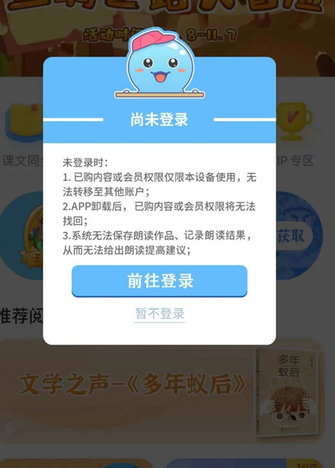 3.点击下方“我的”按钮,会弹出登录提醒页面,点击前往登录,并使用您扫描老师邀请海报的微信绑定手机号码进行登录。