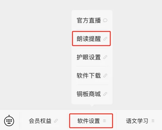 朗读提醒:关注“出口成章家长服务号”并从下方菜单栏找到【朗读提醒】,点击后即可成功绑定。之后可及时在微信收到朗读提醒信息。