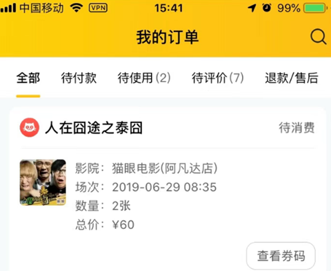 在【订单】中找到尚未取票,需要自助退票的电影票订单