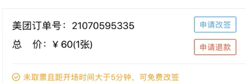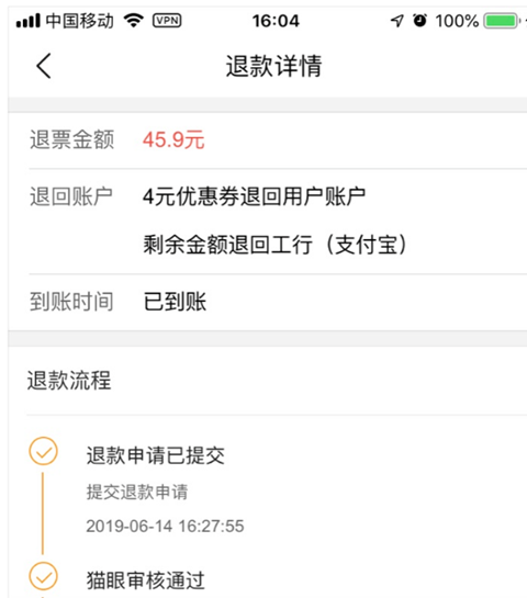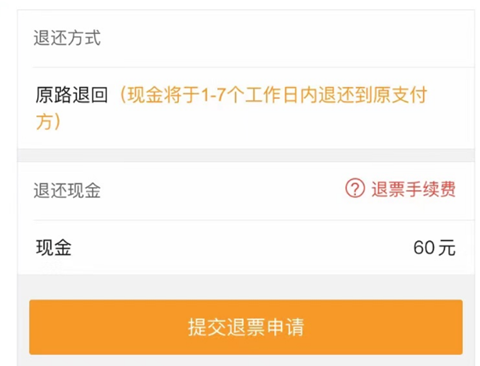 点击进入,找到【申请退款】按钮,点击后开始退票(若按钮为灰色则表明当前订单不满足退票条件)