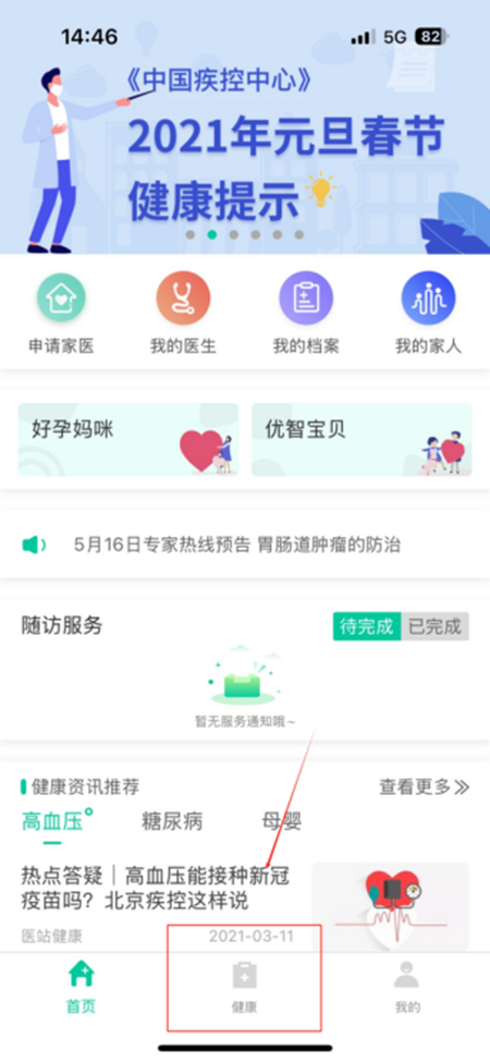 健康”进入居民档案,可查看自己的家庭医生、健康档案、健康体检内容、随访服务、基本信息等