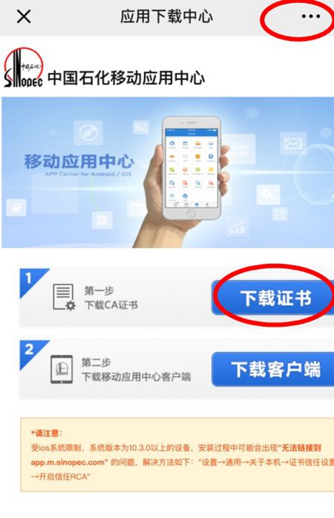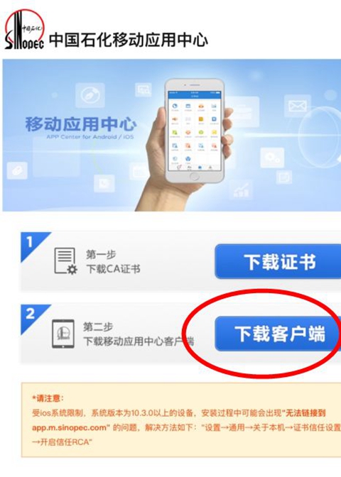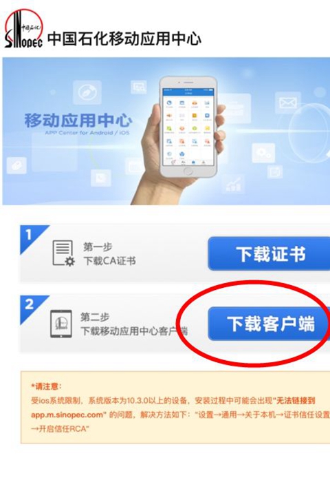 点击“下载客户端”,安装。(受系统限制,系统版本为10.3.0以上版本的设备在安装过程中,可能会出现“无法连接到app.m.sinopec.com”的问题,请进入"设置--通用--关于本机--证书信任设置--开启信任RCA"。)