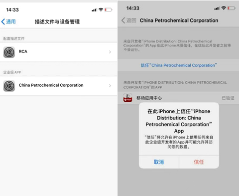 选择信任后,才可以正常打开“中国石化移动应用中心”app。