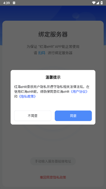 1、在本站下载安装打开,阅读并同意红海eHR的用户协议