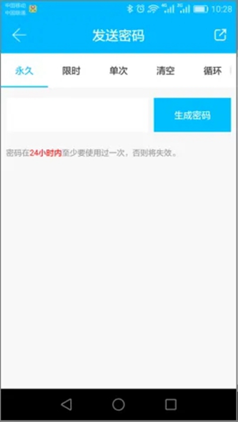 密码也是一种开锁的方式。在锁的键盘上输入密码后,按右下角开锁键即可开锁。密码分为永久、限时、单次、清空、循环、自定义等类型,都由服务器动态生成。
