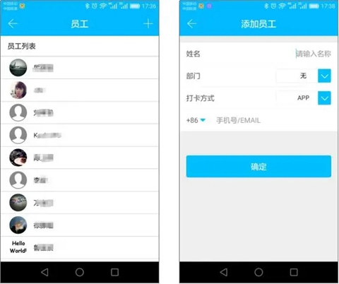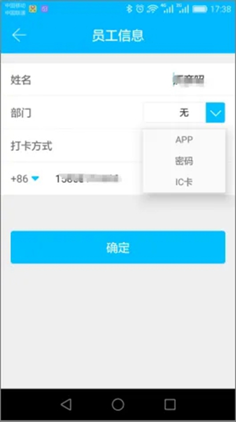 支持用三种方式来考勤,包括App、密码、IC卡。在员工管理里,可以选择一种考勤方式。