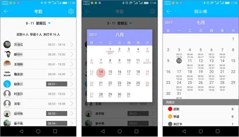 在考勤统计模块,可以查看某天公司所有员工的考勤情况,按到公司时间排序。迟到、早退、未打卡会以三种不同颜色来标识。