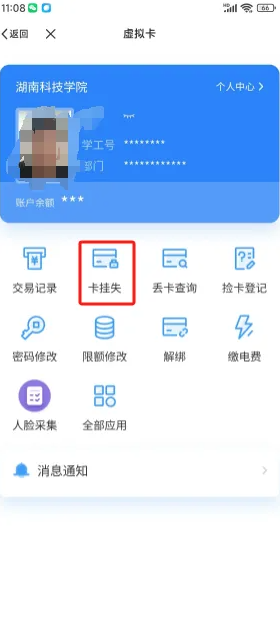 6、点击‘卡挂失’,可以对校园卡进行挂失操作,进入后点击‘立即挂失’,确定后需要输入校园卡密码,默认密码为:身份证后六位,X用0或1代替,如您申领了校园卡,使用中校园卡丢失,请及时进行挂失;