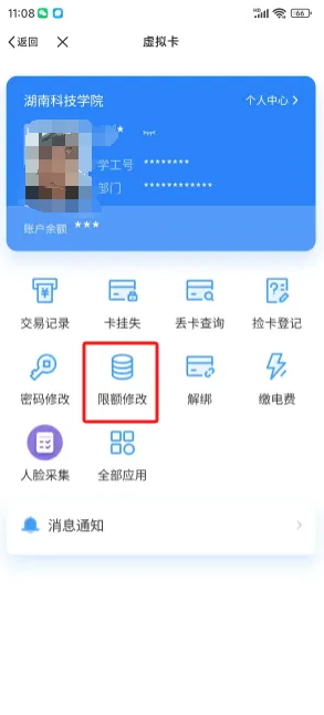 9、点击‘限额修改’,可以对您的校园卡限额进行修改,点击修改后,输入需要的额度,点击确定修改即可完成。为避免您的资金受到损失,可以结合自己的消费习惯,修改合适的金额。