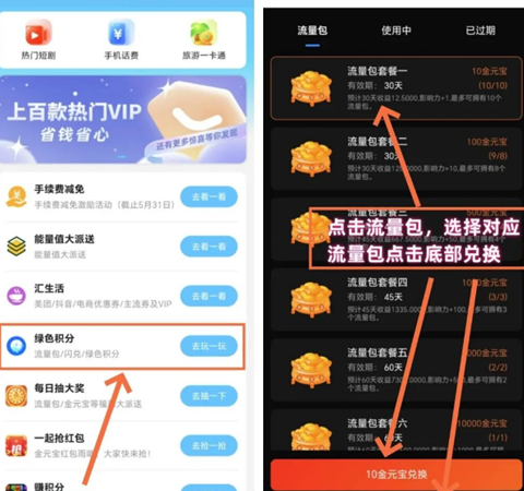 兑换流量包(可用元宝够10个一定记得兑换流量包)兑换步骤:赚元宝-绿色积分-流量包-选择对应流量包然后点击下边的兑换