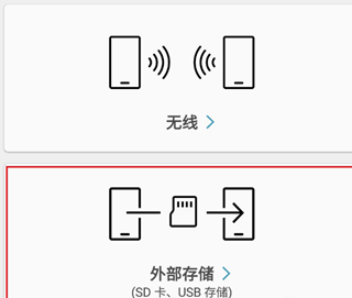 5、接着选择将内容传输至新手机的方式,这里以选择【无线】为例(说明:在旧设备上也需要选择【无线】方式);