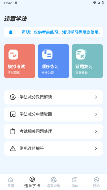 违章学法学习与查找:提供交通法规学习与习题练习,帮助您在了解相关法规的同时,巩固安全驾驶知识。
