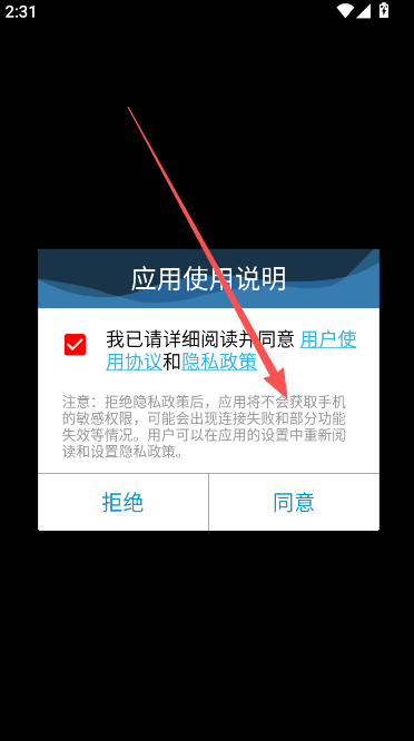 1、阅读软件详细阅读并同意用户使用协议和隐私政策,点击同意进入。