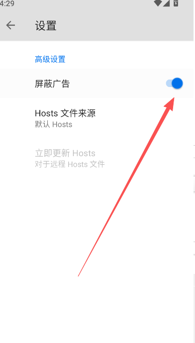 3、点击高级设置栏目中的图标,开启以后就屏蔽所有进入网页浏览的广告部分了。