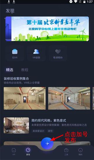 2、安装完成打开呈现出几个模块,VR,发现,工具,我的,点击中间的加号可以发布自己的视频和照片其他。